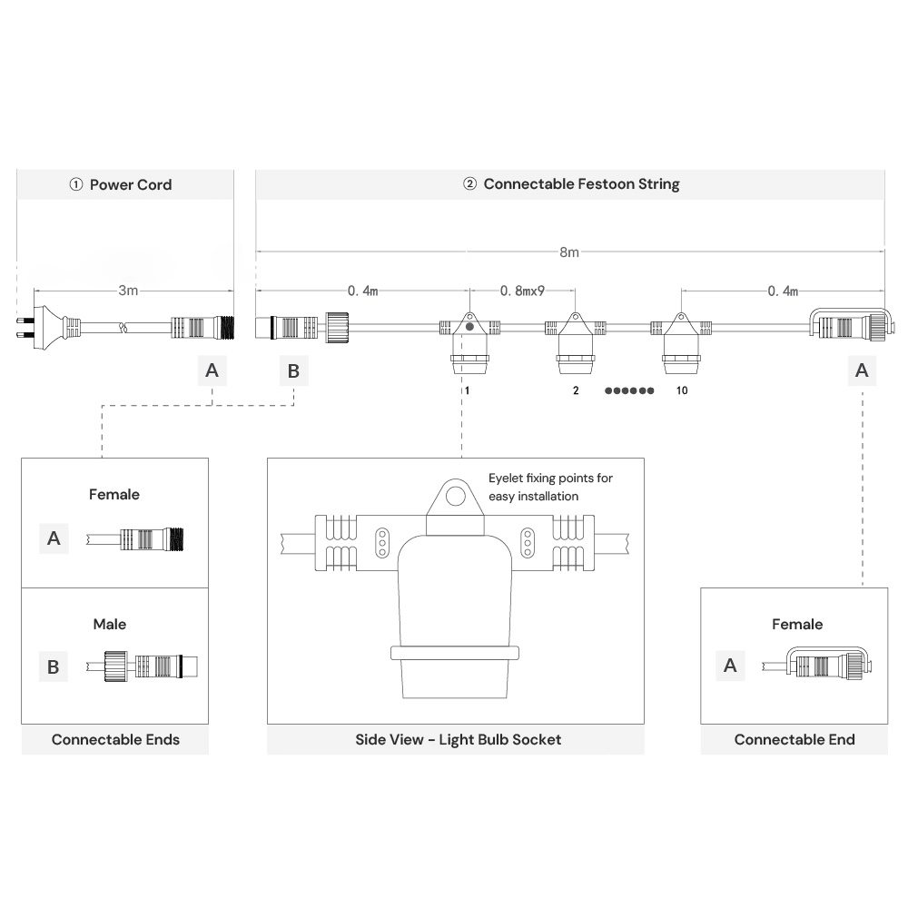 The Festoon String Light package contains everything required for basic installation and includes free 11W incandescent S14 bulbs with E27 Edison Screw bases. The string light features waterproof silicon rubber lamp holders spaced 80cm apart and has waterproof universal joints at both ends for connecting multiple strings. The string also includes a 240V Australian Standard 2-pin plug and can be used with selected LED light bulbs